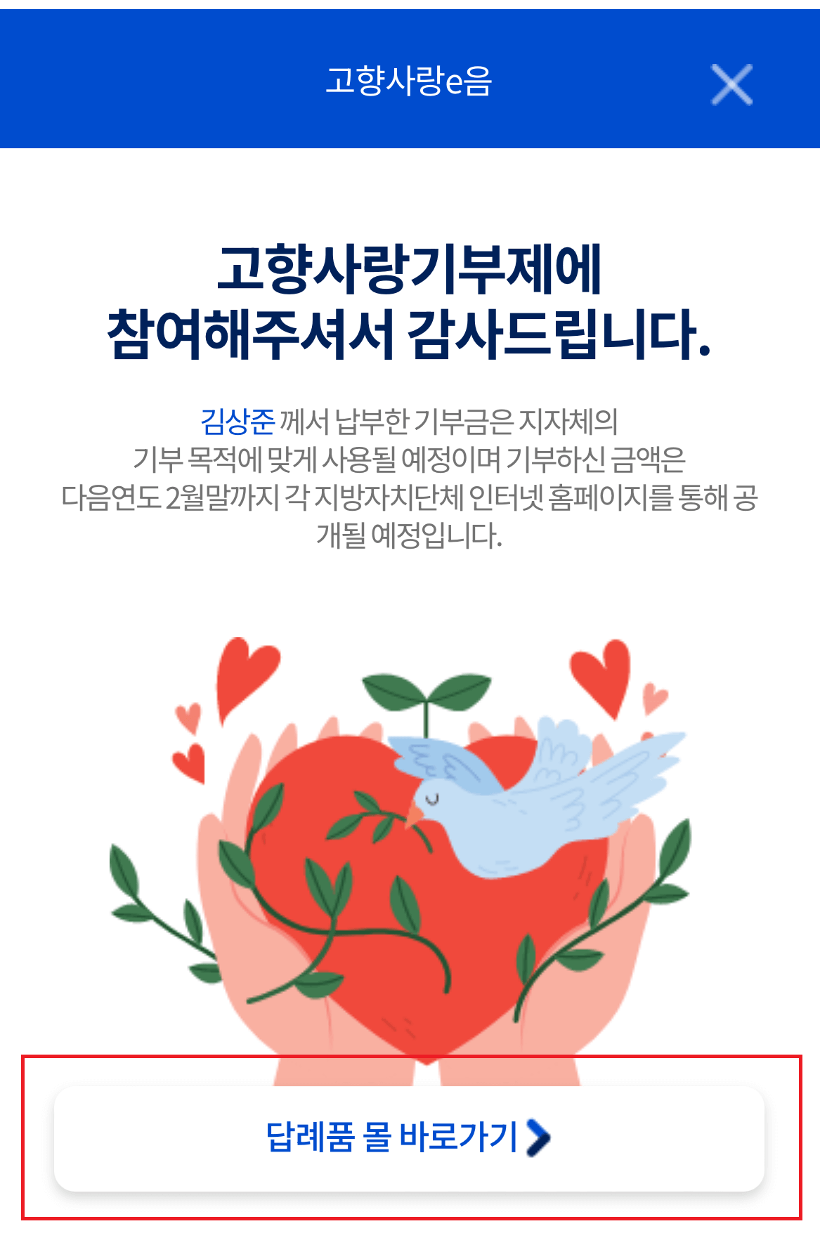 7) 기부 완료 후 답례품을 받기위해서 답례품 몰로 이동합니다.