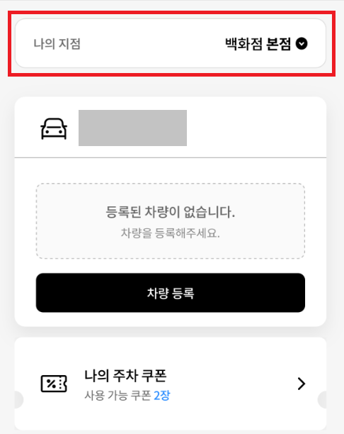 ② [현재 지점]을 '백화점 본점'으로 선택하신 후, 주차 쿠폰을 확인해 보면 본점 무료 주차 쿠폰을 받을 수 있습니다.