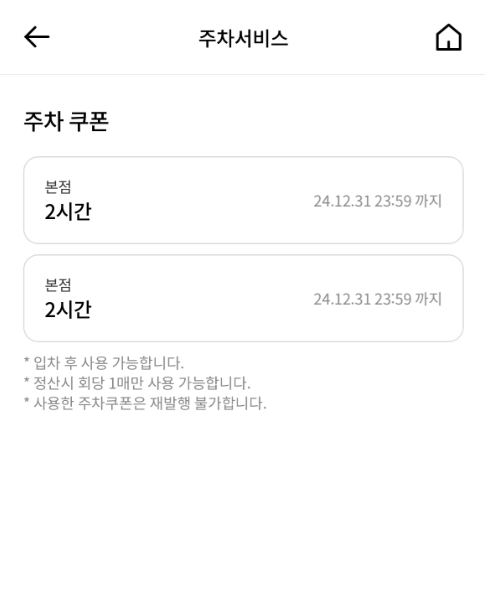주의하실 점은 1회당 쿠폰을 한 번만 쓸 수 있기 때문에 4시간 무료주차는 되지 않으며, 사용하시려면 2시간 동안 정산하고 나가셨다가 다시 주차하셔야 합니다.