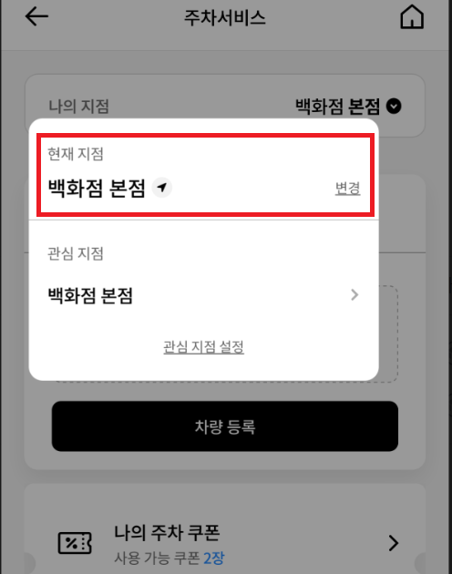 ② [현재 지점]을 '백화점 본점'으로 선택하신 후, 주차 쿠폰을 확인해 보면 본점 무료 주차 쿠폰을 받을 수 있습니다.