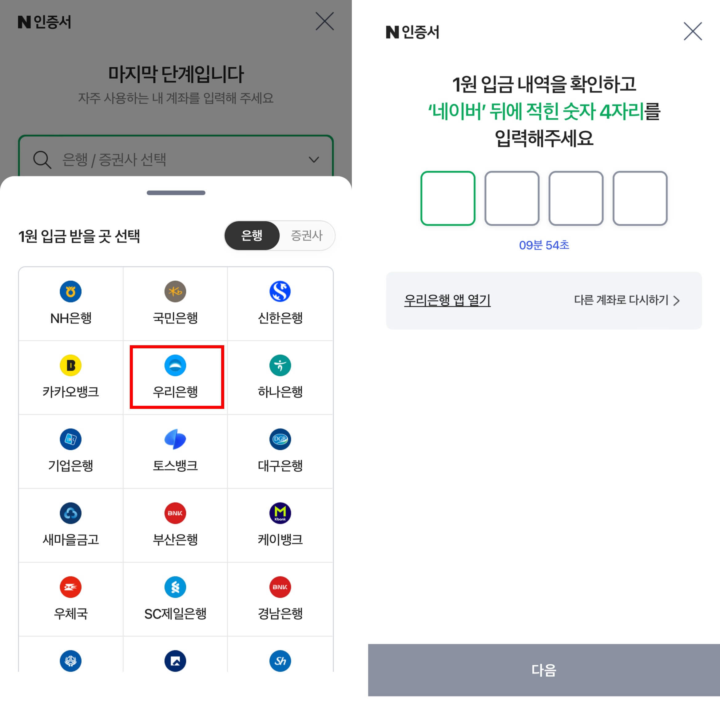 예를 들어 우리은행에 1원이 입금되어 있고 입금자가 '네이버1234'라면 1234를 입력하시면 됩니다.