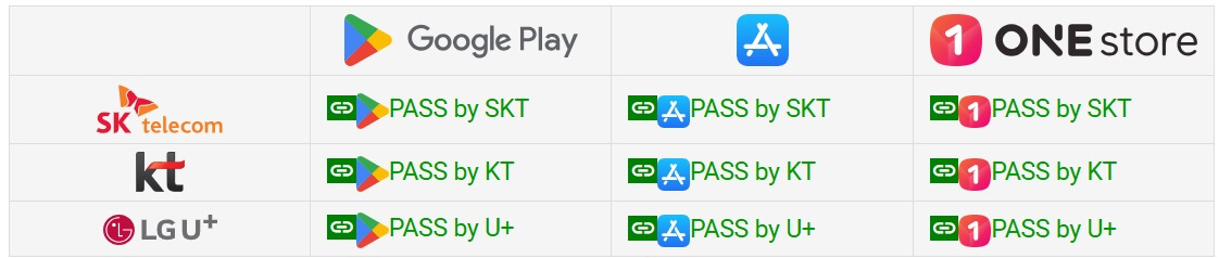 같은 PASS앱이라도 통신사별로 다르며 아래 링크를 통해서 들어가시면 아래와 그림과 같이 종류별로 다운로드하실 수 있습니다.