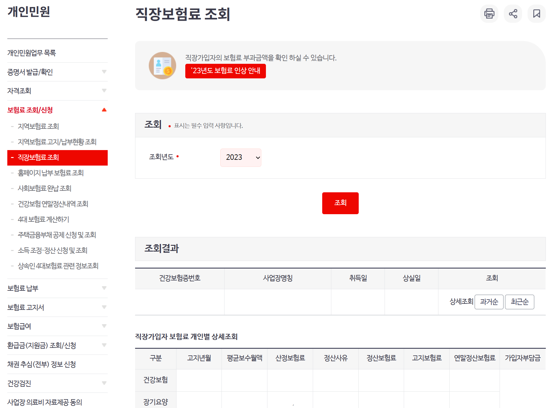 ② 왼쪽에서 [지역보험료 조회] 또는 회사에 근무하시는 분들은 [직장보험료 조회]를 선택하여 바로 확인가능합니다.