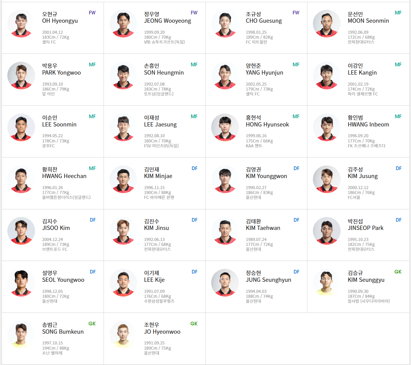 - 미드필더: 문선민, 박용우, 송흥민, 양현준, 이강인, 이순민, 이재성, 홍현석, 황인범, 황희찬