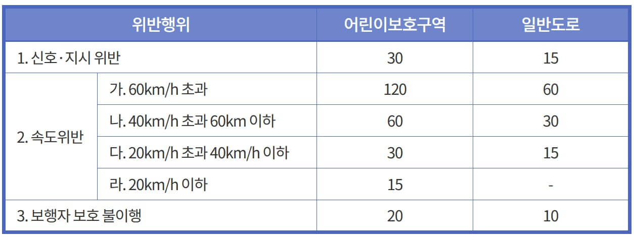 | 위반행위 | 어린이보호구역 | 일반도로 | |