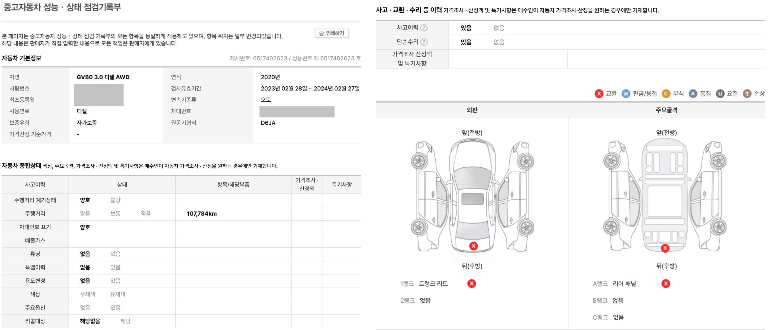 - 차량의 연식, 주행거리 등의 차량 정보와 사고 및 수리, 검사에 대한 이력이 있는 기록부