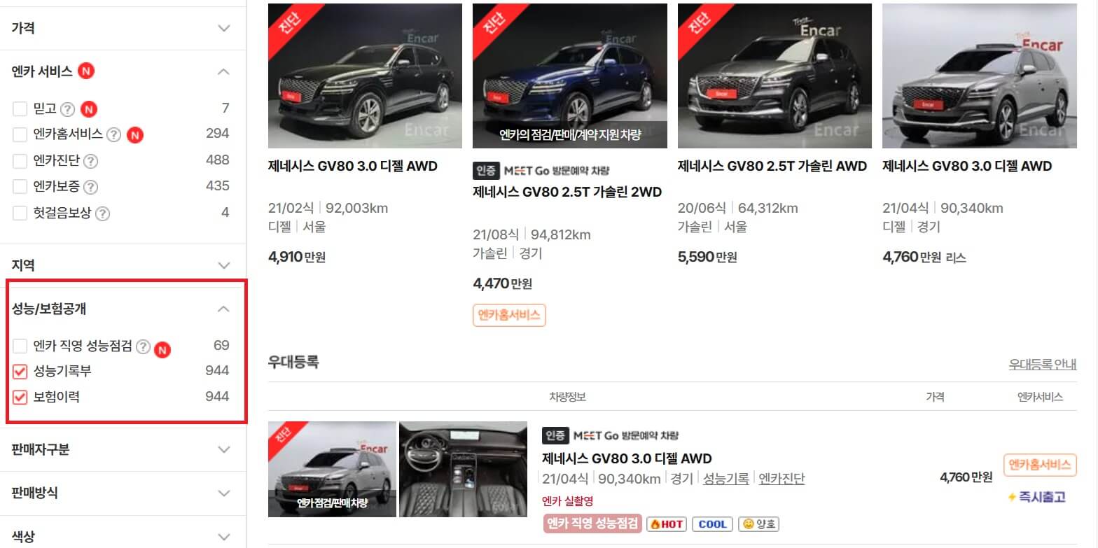 위에서 설명드린 성능점검기록부와 보험이력이 모두 있는 차량으로 검색하시려면 엔카 페이지의 좌측에서 체크하실 수 있습니다.
