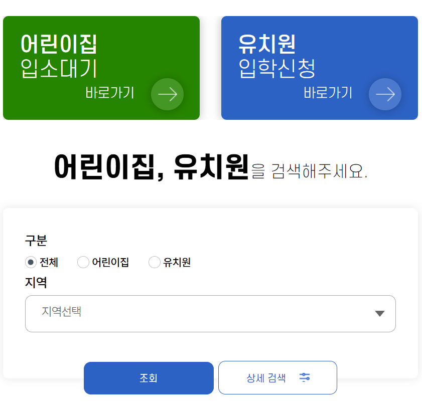 · 어린이집 입소대기: '아이사랑' 사이트 · 유치원 입학신청: '처음학교로' 사이트 |