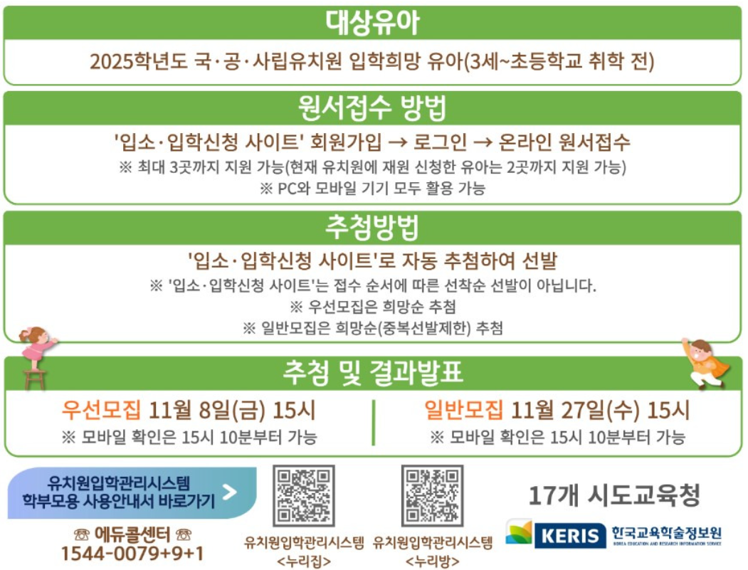 유치원 선발의 추첨 결과는 우선모집은 11/8(금), 일반모집은 11/27(수)에 확인하실 수 있습니다.