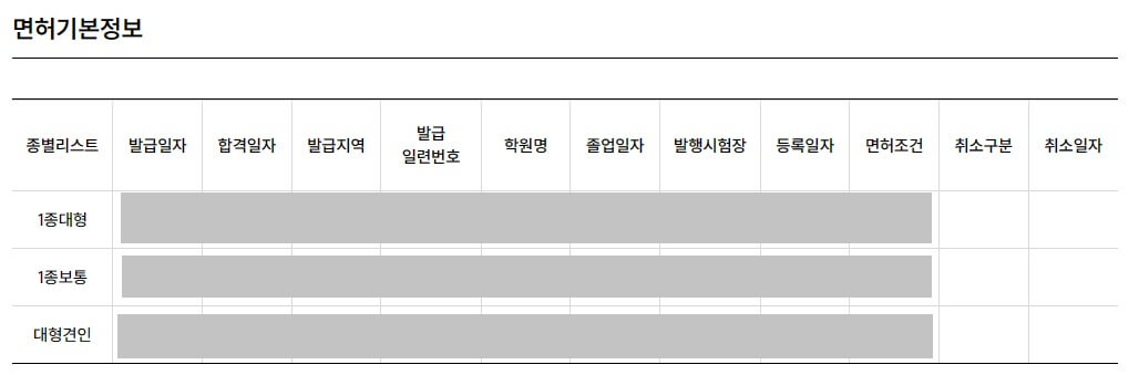 • 면허별(1종, 2종, 보통, 대형 등) 발급/합격일자, 발급지역, 일련번호, 학원명 등