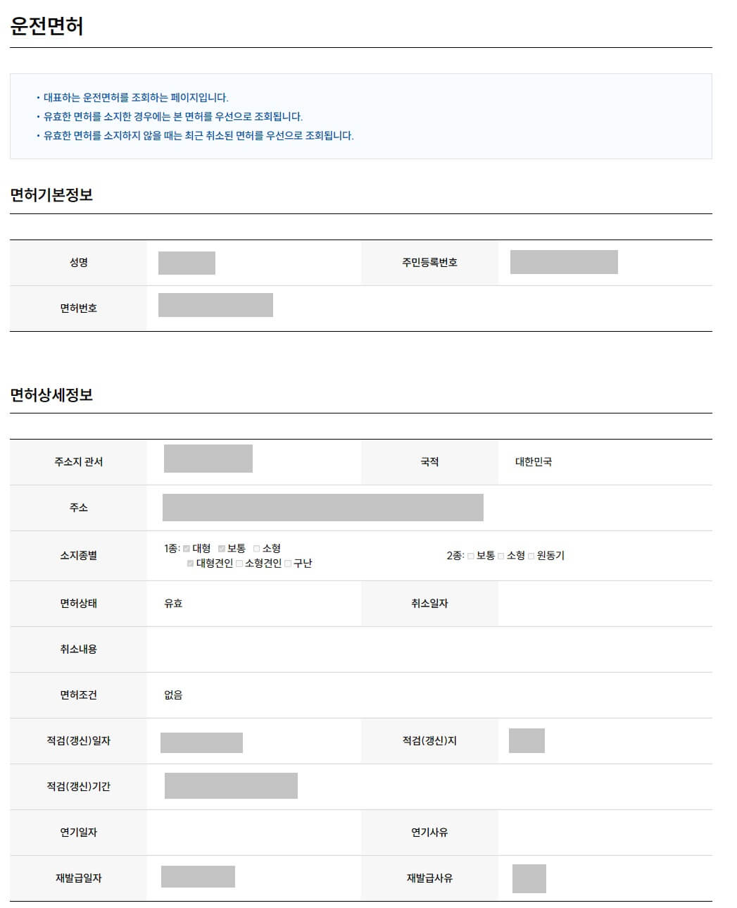 - 주소지관서, 소지종별(운전면허 종류), 면허상태, 취소상태(내용), 적검(갱신) 일자, 적검(갱신) 기간, 재발급 일자/사유 등
