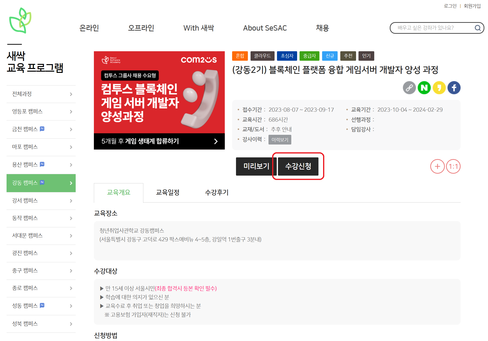 1) 청년취업사관학교 에 가입 후 오프라인 / 캠퍼스 지역 선택