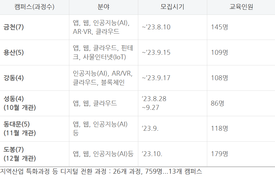 교육 과정은 앞에서 말씀드린 ① 기업 연계형 교육과정 외에 ② 캠퍼스별 소프트웨어 개발자 과정, 또한 문과생의 취업난을 해소하기 위한 디지털 인재로 전환하는 ③ 디지털 전환 과정 총 3가지가 있으며 이에 대해서 자세하게 말씀드리겠습니다.