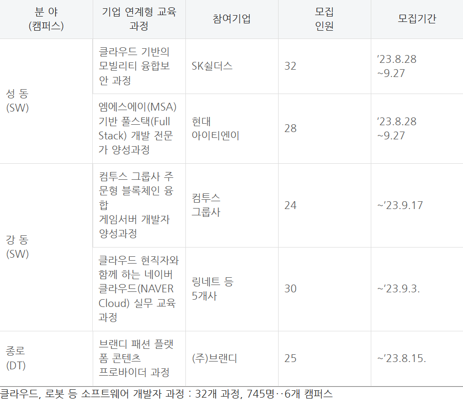 특히 이번에는 기업 맞춤형 인재를 양성하여 수료 후 바로 기업에서 취업/근무할 수 있는 '기업 연계형 교육과정' 강의가 5개나 개설됩니다. SK쉴더스, 현대아이티엔이, 컴투스 그룹사 등에서 운영하는 과정은 수료생의 60%를 채용할 계획입니다.