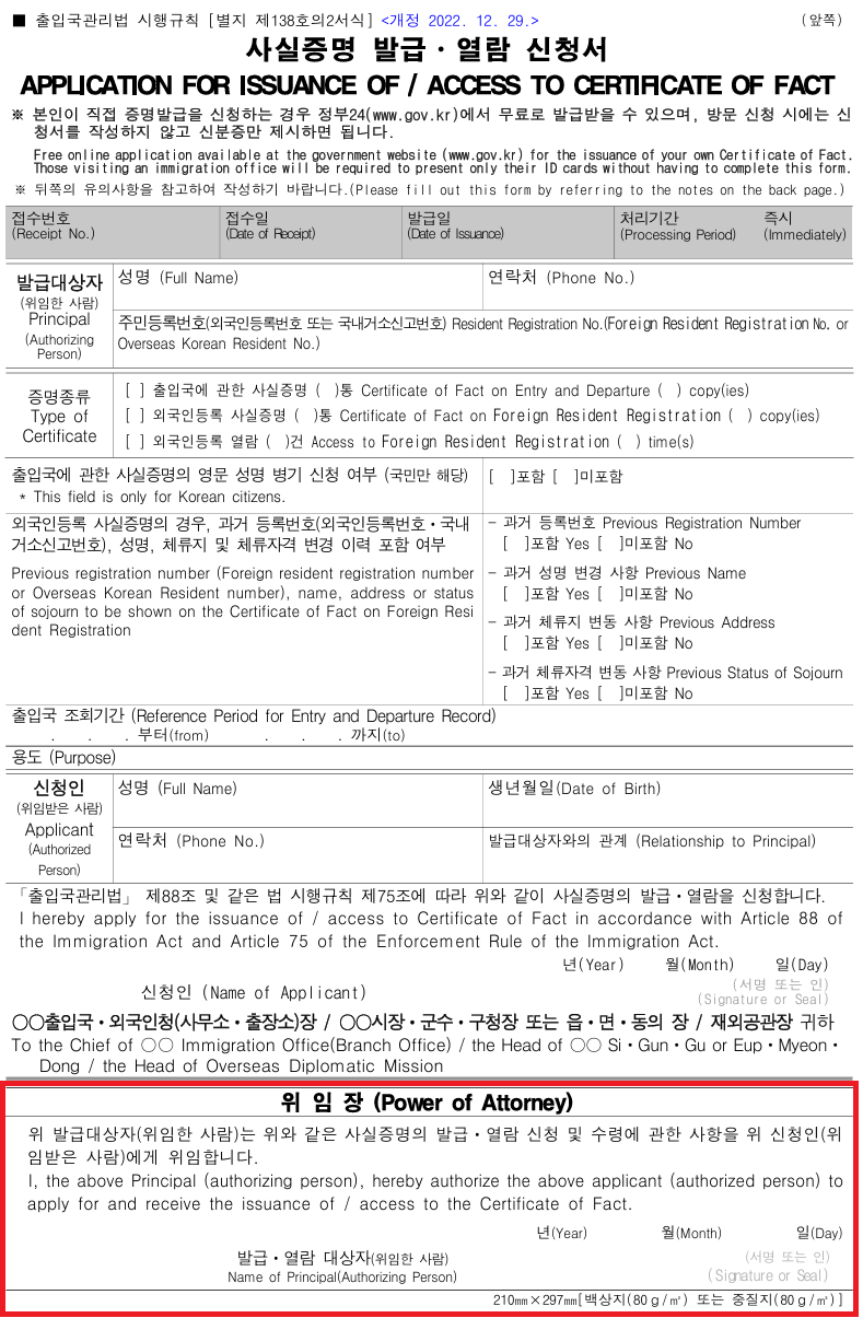 - 출입국사실증명 신청서 및 위임장(하나의 서류임)
