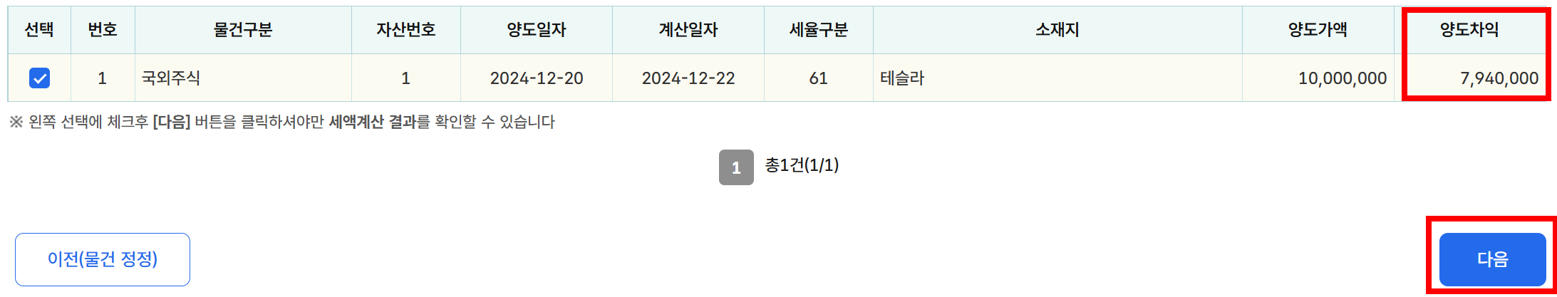 Step6. 양도차익을 확인한 후, 다음버튼을 클릭한 후, 기본 공제 250만 원을 적용합니다.