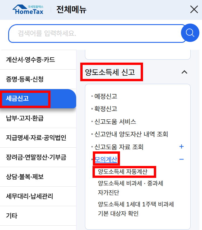 - 메뉴 선택: '전체 메뉴'에서 [세금신고] > [양도소득세 신고]를 선택합니다.