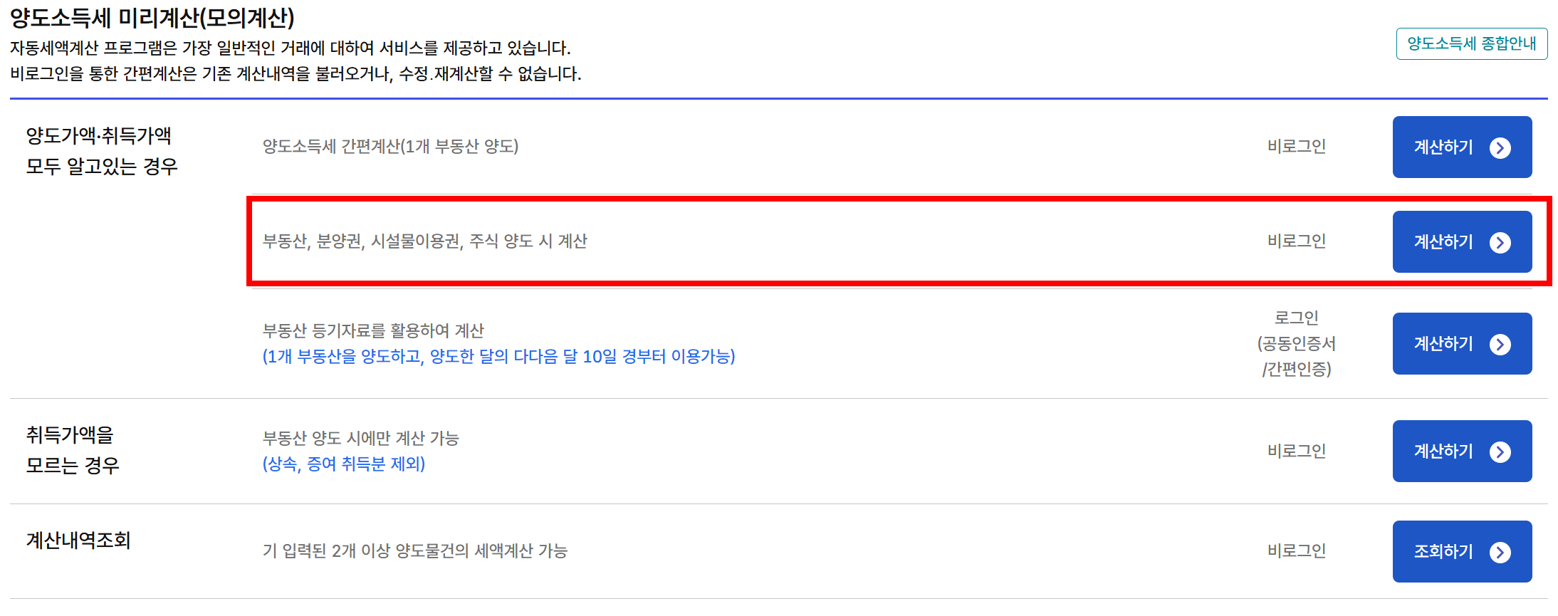 Step3. '양도가액·취득가액을 모두 알고 있는 경우'에서 [부동산, 분양권, 시설물이용권, 주식 양도 시 계산]을 선택합니다.