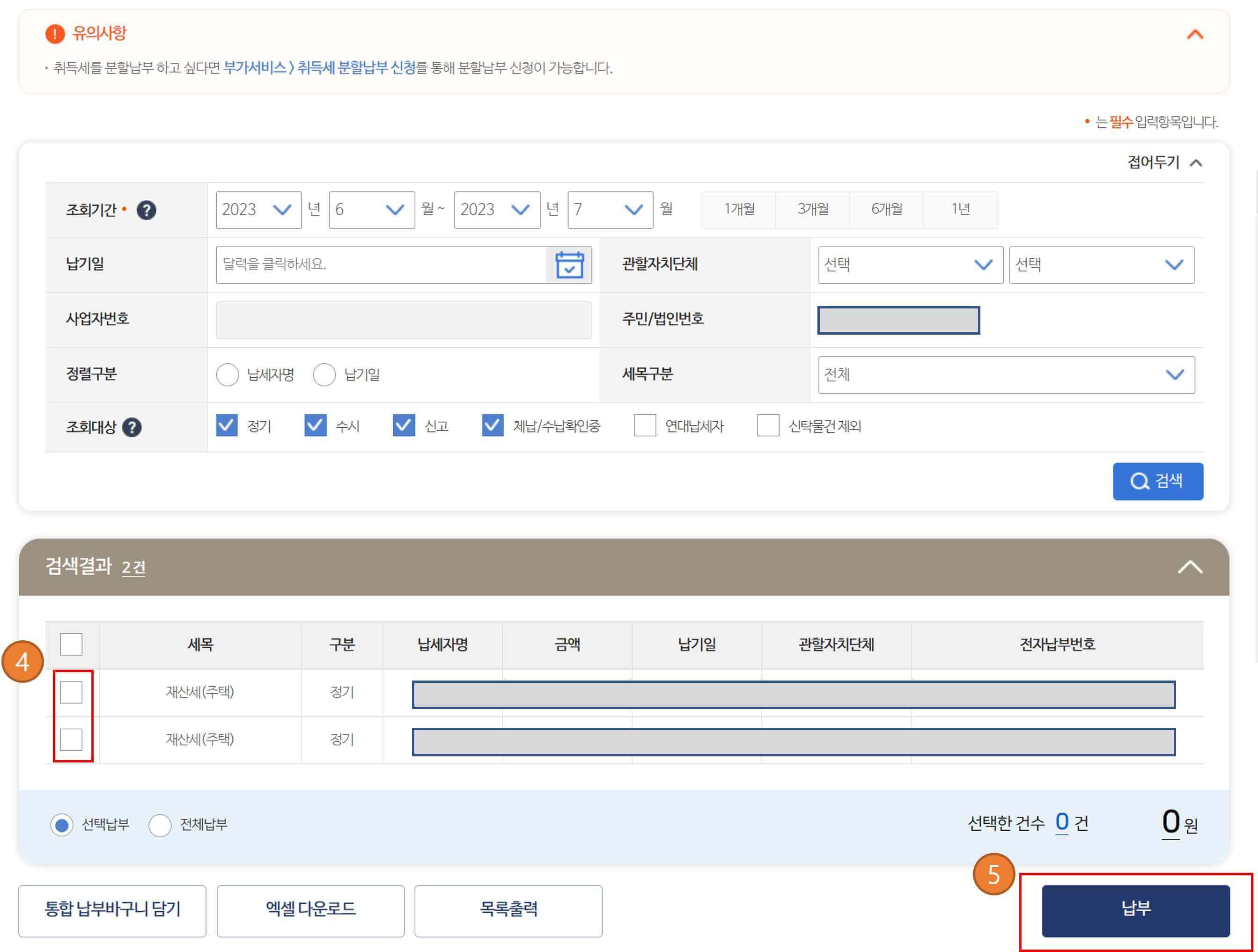 (2) 납부할 지방세(재산세)를 선택합니다. (아직 납부 버튼은 누르지 않습니다.)