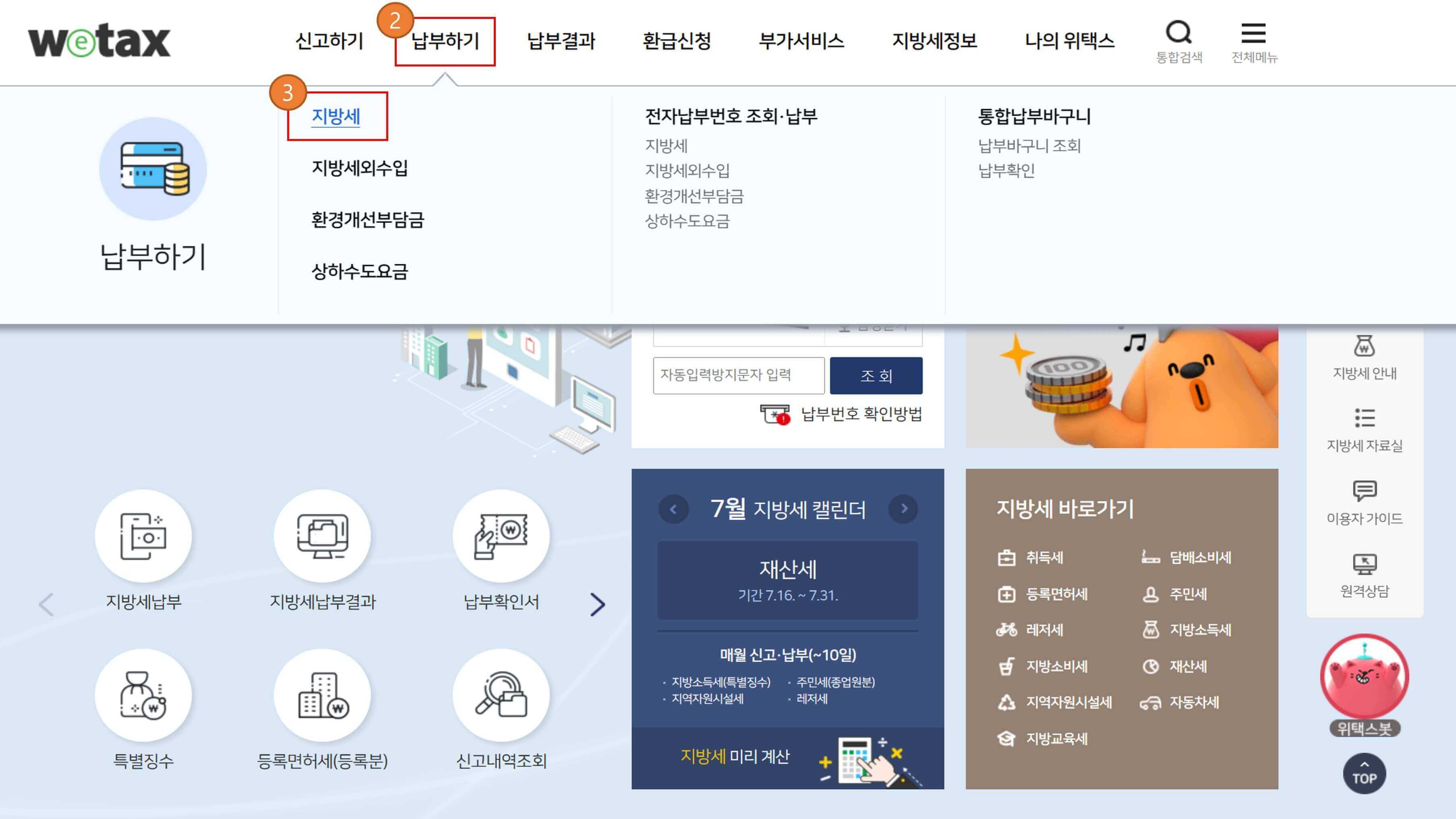 재산세는 지방세이므로 '위택스'에서 납부합니다. 위에서 설명드린 것과 같이 미납 시에는 3%의 가산세가 부과되기 때문에 잊지 말고 빨리 납부하는 것이 중요합니다.