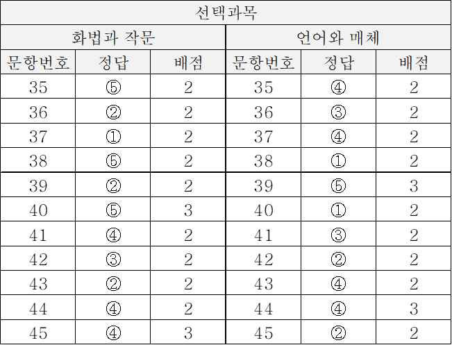 | 문항번호 | 정답 | 배점 | 문항번호 | 정답 | 배점 |