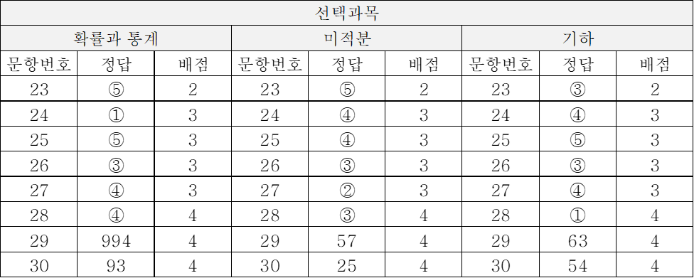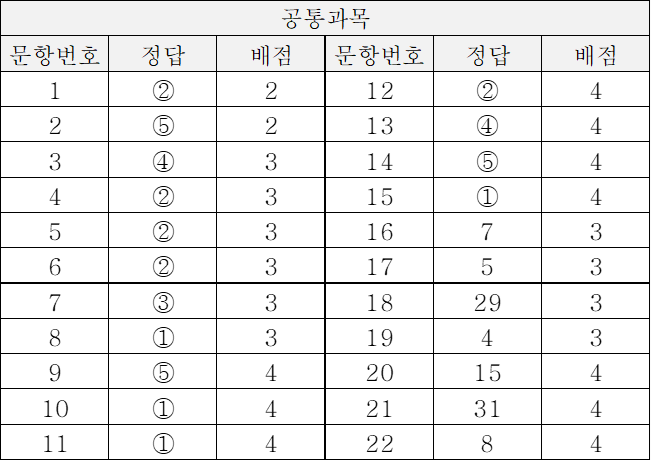 | 문항번호 | 정답 | 배점 | 문항번호 | 정답 | 배점 |