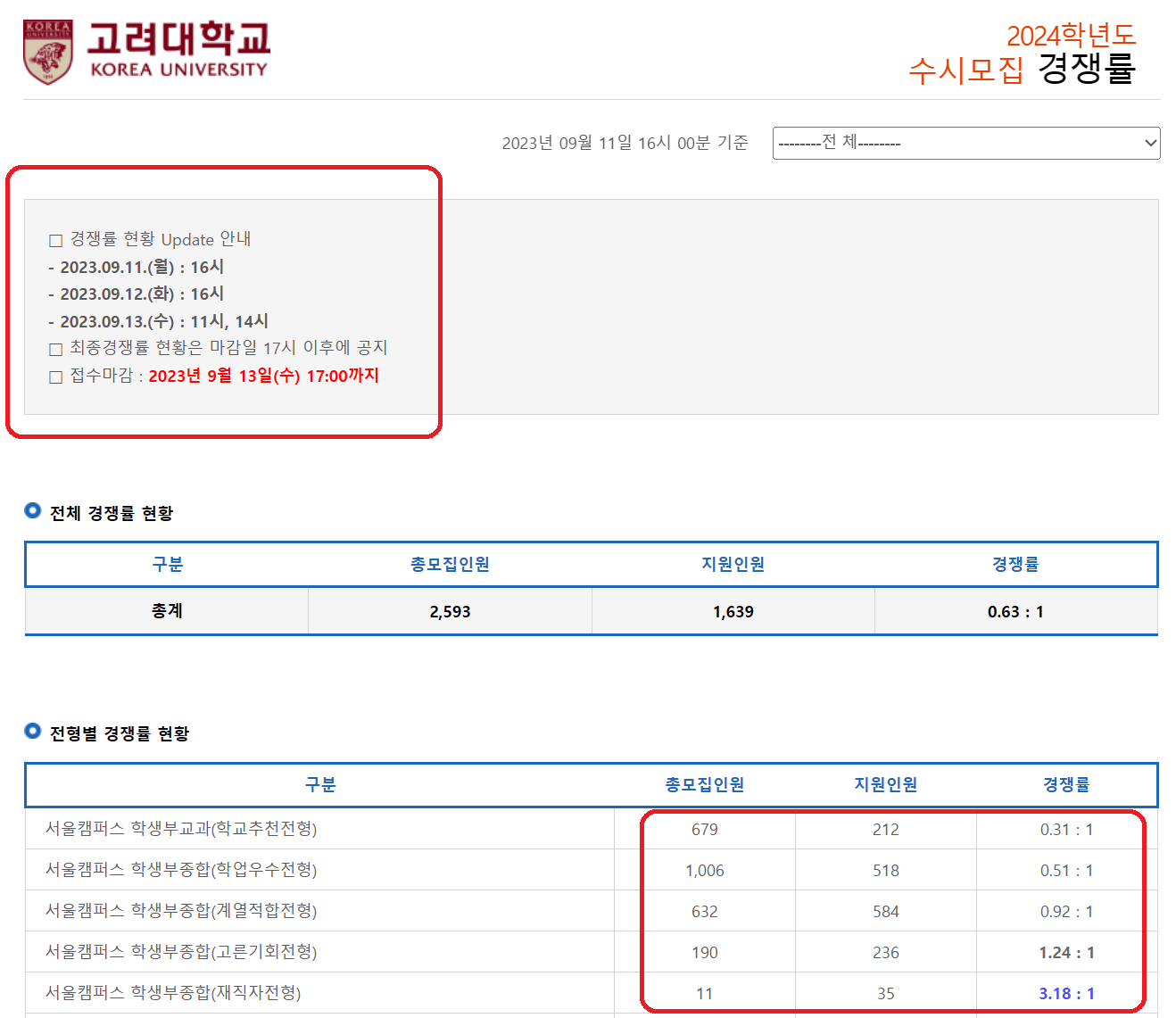 | 경희대 | 9/13(수) 18:00 | 10시, 17시 | 12시 19시 이후 최종공지 |