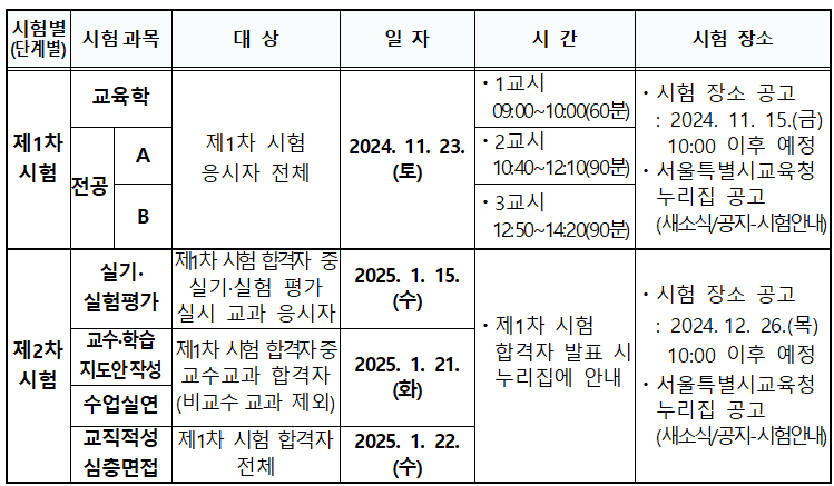 | 1차 시험 합격자 | 24.12.26(목) 10:00 이후 예정 | 서울특별시교육청 누리집 (새소식/공지-시험안내) |