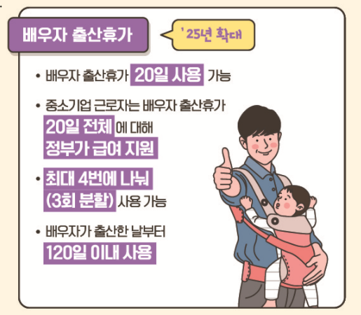 남편의 출산 휴가기간이 20일로 확대되었을 뿐만 아니라, 출산 후 120일 이내에 사용할 수 있도록 사용기간도 늘어났는데요.