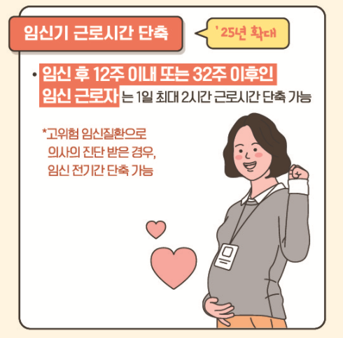 특히, 유산, 조산 등의 위험이 있는 고위험 임신 질환이 있는 여성 근로자는 임신 전체 기간에 대해서 단축된 근로시간으로 일할 수 있다고 합니다.