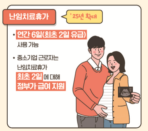 난임치료 지원을 위한 휴가가 기존의 3일에서 6일, 유급휴가도 1일에서 2일로 늘어났습니다.
