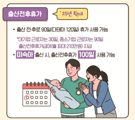 미숙아를 출산 시에는 아이를 조금 더 오래 돌볼 수 있도록 출산전후휴가가 기존 90일에서 100일로 확대되었습니다.
