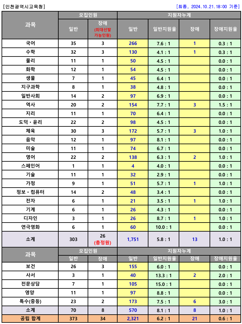 작년대비 경쟁률이 낮아진 부분은 파란색, 높아진 부분은 붉은색으로 표시하였으니 쉽게 파악하실 수 있습니다. 교육청 중등 임용고시 경쟁률