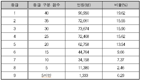 | 등급 | 표준 점수 | 인원(명) | 비율(%) |
