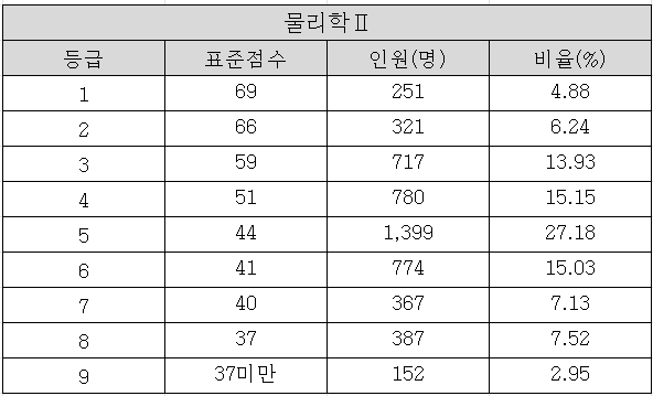- 물리학Ⅱ의 1등급 구분점수는 69점이며 비율은 4.88%, 인원은 251명입니다.